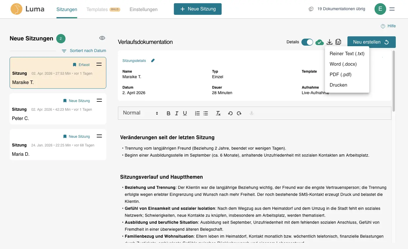 Mit LumaNote entfällt das Mitschreiben während der Sitzung. Die KI unterstützt Sie bei der späteren Dokumentation – strukturiert, vollständig und orientiert an klinischen Standards. Sie können sich während der Sitzung ganz auf das therapeutische Gespräch konzentrieren, ohne Risiko relevanter Informationsverluste